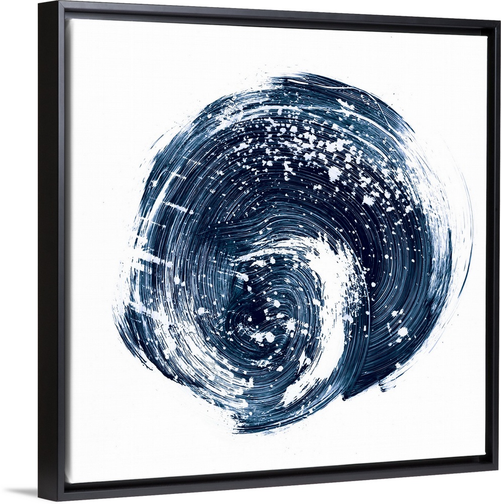 <p>Contemporary abstract painting of a circular nebula shape in a dark indigo blue against a white background.</p>