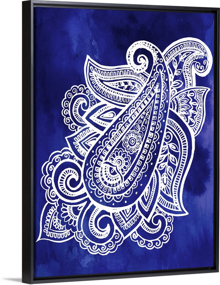 <p>Artistic design of a large paisley pattern in white on an indigo blue backdrop.</p>