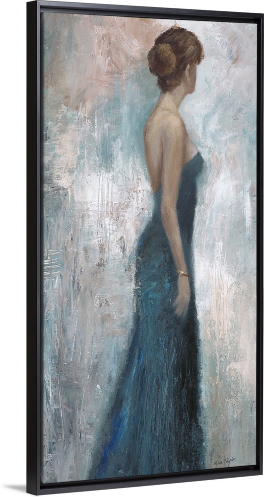 <p>Contemporary painting of a woman wearing a blue dress looking to her left.</p>