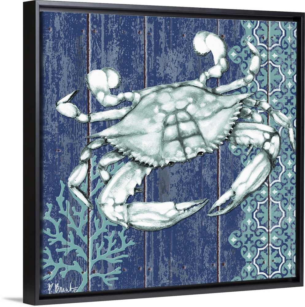<p>Contemporary decorative artwork of a crab with coral and a floral pattern on a textured panel background.</p>