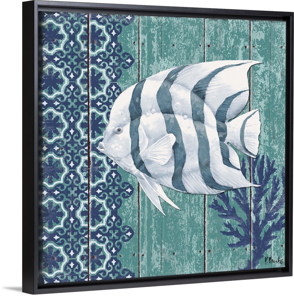 <p>Contemporary decorative artwork of an angel fish with coral and a floral pattern on a textured panel background.</p>