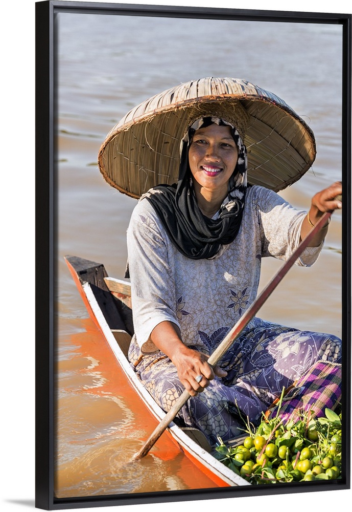 <p>Indonesia, South Kalimatan, Lok Baintan. A woman in a wide-brimmed hat rows her small wooden boat at a floating market on the Barito River.</p>