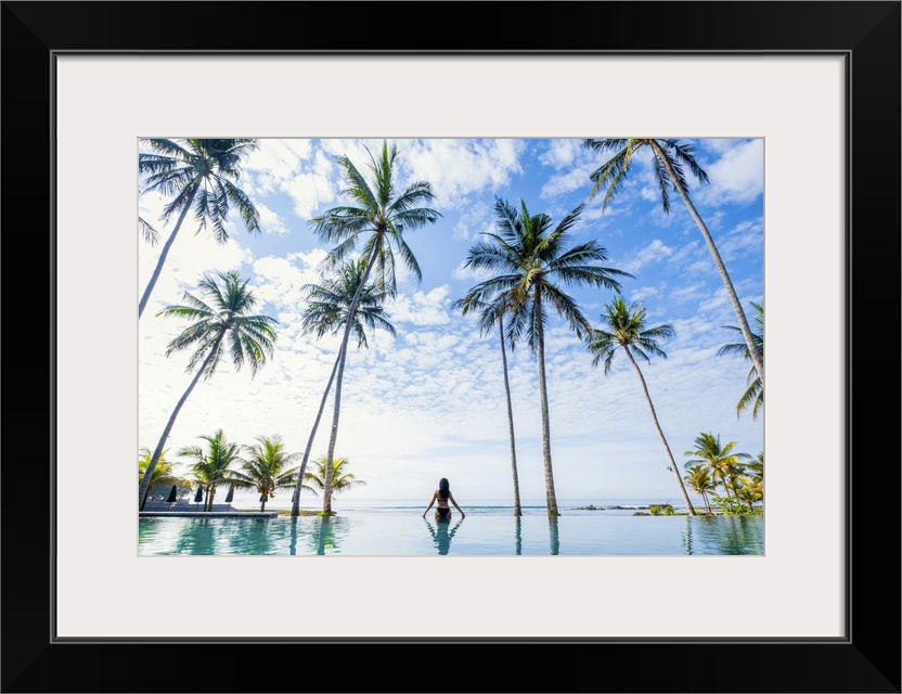 <p>Southeast Asia, Indonesia, Bali, Candidasa. A woman looking out over the ocean from an infinity pool. Back turned to camera MR</p>