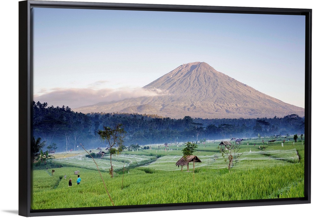 <p>Indonesia, Bali, Mount Agung over rice terraces of the Abang region in early morning.</p>