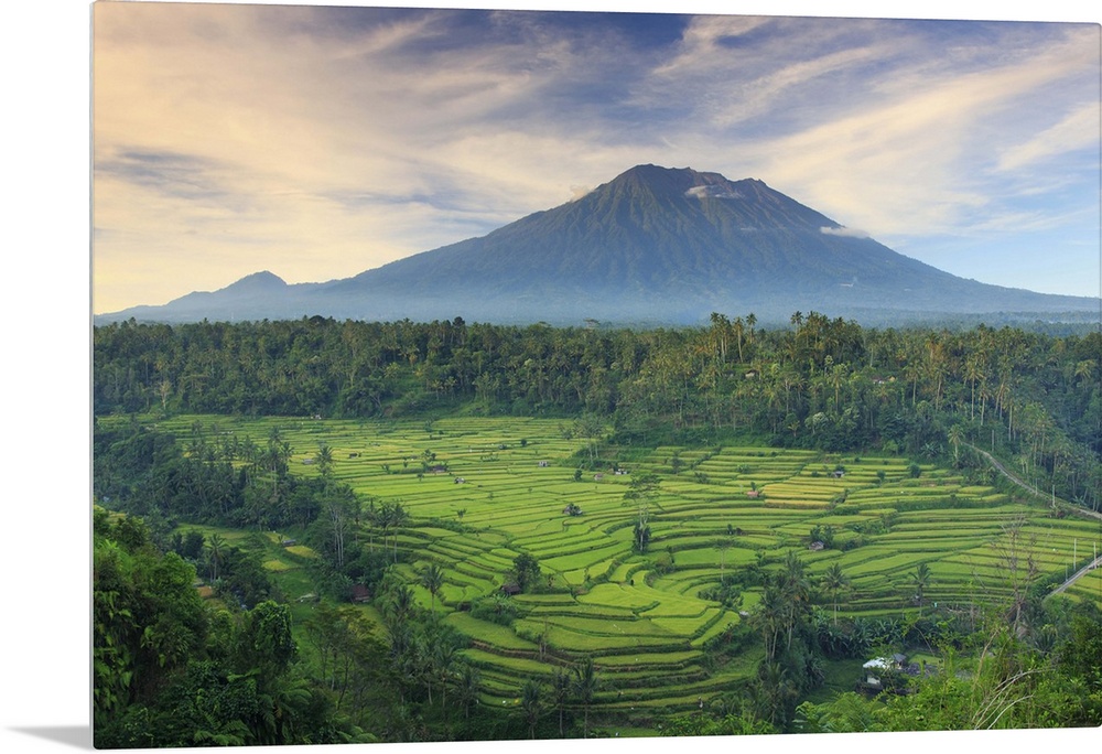 <p>Indonesia, Bali, Redang, View of Rice Terraces and Gunung Agung Volcano</p>