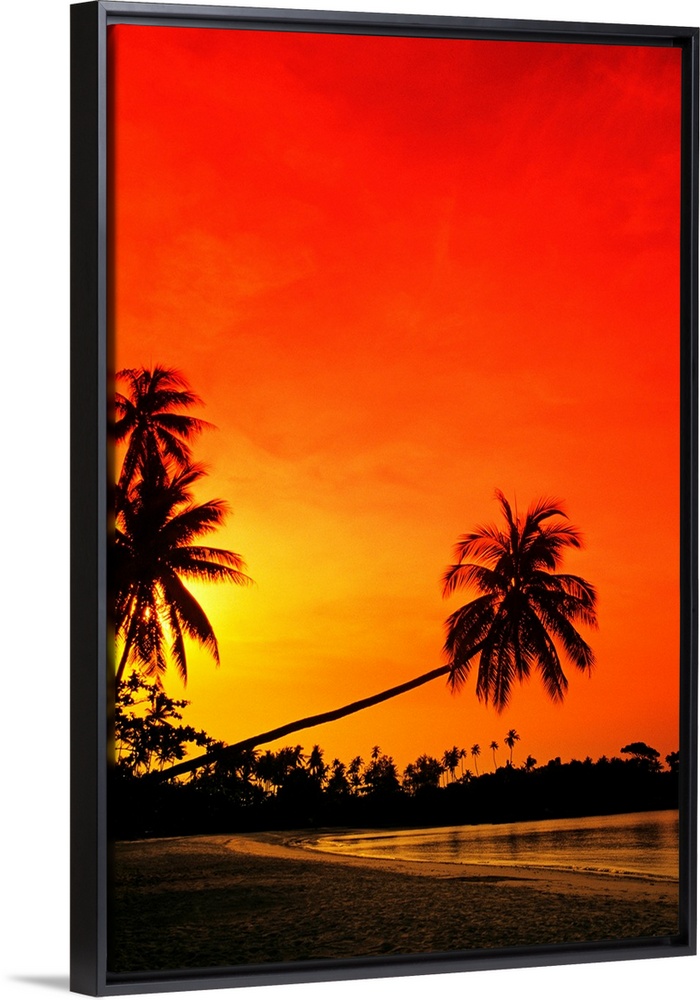 <p>Photograph taken of a long palm tree that stretches out over the beach to the edge of the ocean. A line of trees on the coast is silhouetted by the warmly colored sky.</p>