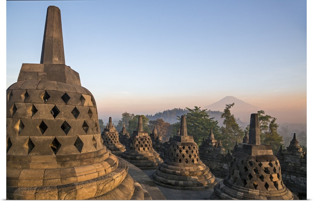 <p>Indonesia, Java, Borobudur. Early morning sun shines on the dormant Stratovolcano, Mount Sumbing, with the famous 9th century Buddhist temple at Borobudur in the foreground.</p>