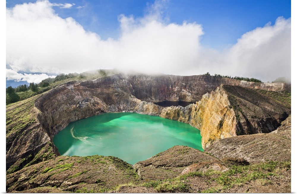 <p>Indonesia, Flores Island, Moni. Low clouds lift to reveal two of the stunning crater lakes of Mount Kelimutu, a dormant volcano which last erupted in 1869.</p>