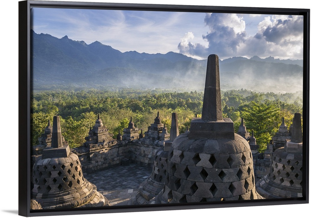 <p>Indonesia, Java, Borobudur. The famous 9th century Buddhist temple at Borobudur with the Menoreh Mountain Range in the distance. Each stupa houses a cross-legged statue of Buddha seated in the lotus position.</p>