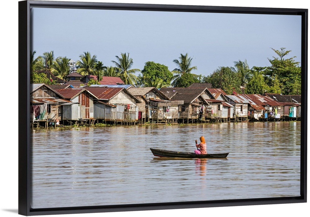 <p>Indonesia, South Kalimatan, Banjarmasin. A woman rows towards houses on stilts lining the banks of the Barito River. Approximately 25% of Banjarmasin's population of 800,000 people live along its rivers and its canals.</p>