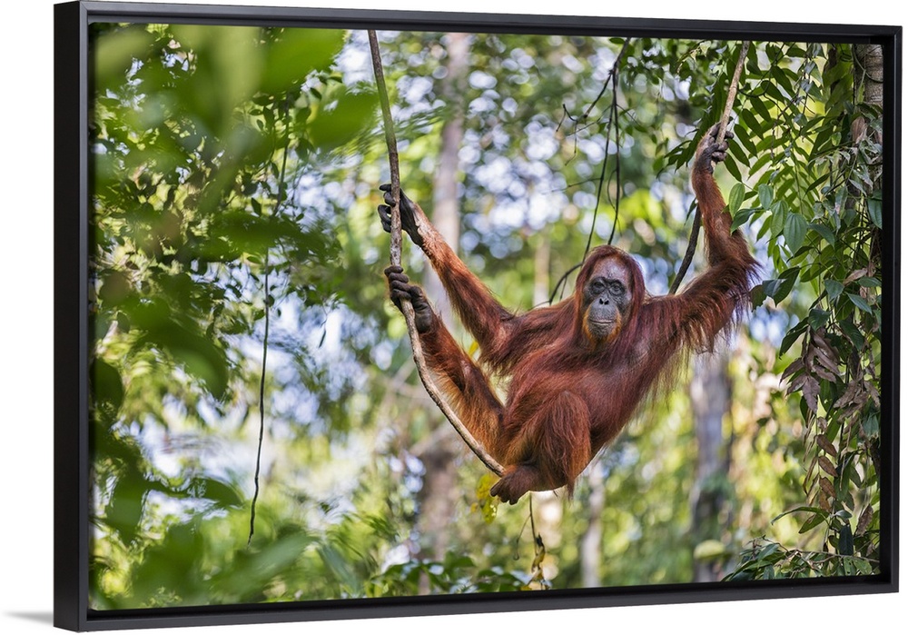 <p>Indonesia, Central Kalimatan, Tanjung Puting National Park. A female Bornean Orangutan relaxing on a liana hanging from a tree.</p>