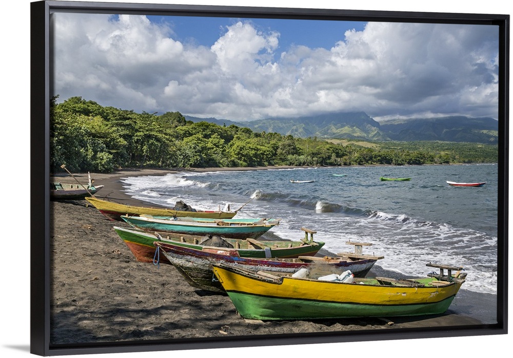 <p>Indonesia, Flores Island, Waelengga. The beach with fishing boats at Waelengga. The dark sand highlights the volcanic nature of the region.</p>