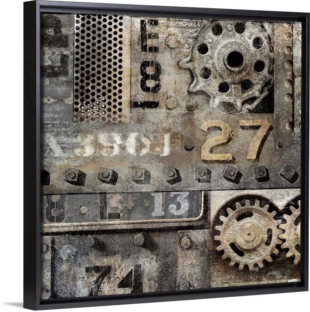 <p>Industrial themed square abstract in shades of gray, white, black, gold and silver.</p>