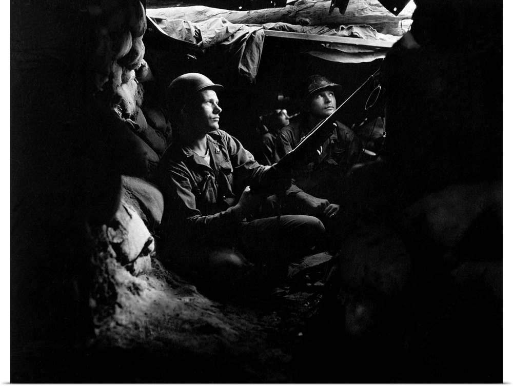 <p>Infantrymen take advantage of cover and concealment in tunnel positions, 1952.</p>