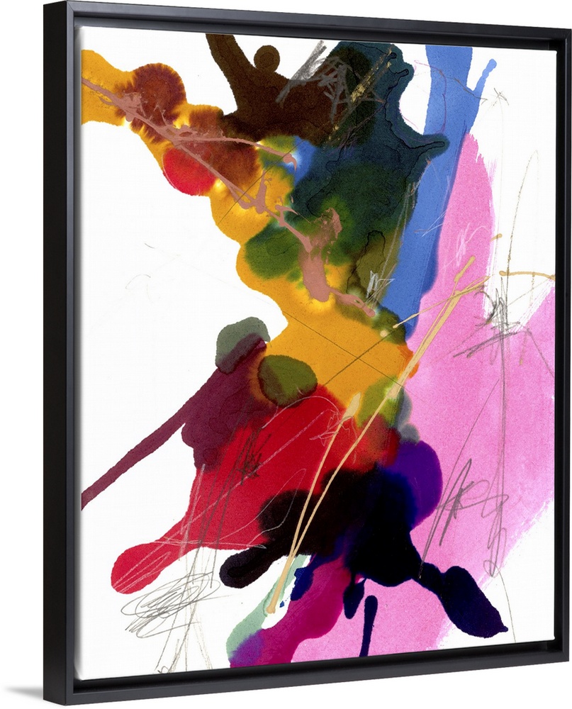 <p>Contemporary abstract painting with a mix of bright pink, red, yellow, and blue, over white with light streaks.</p>