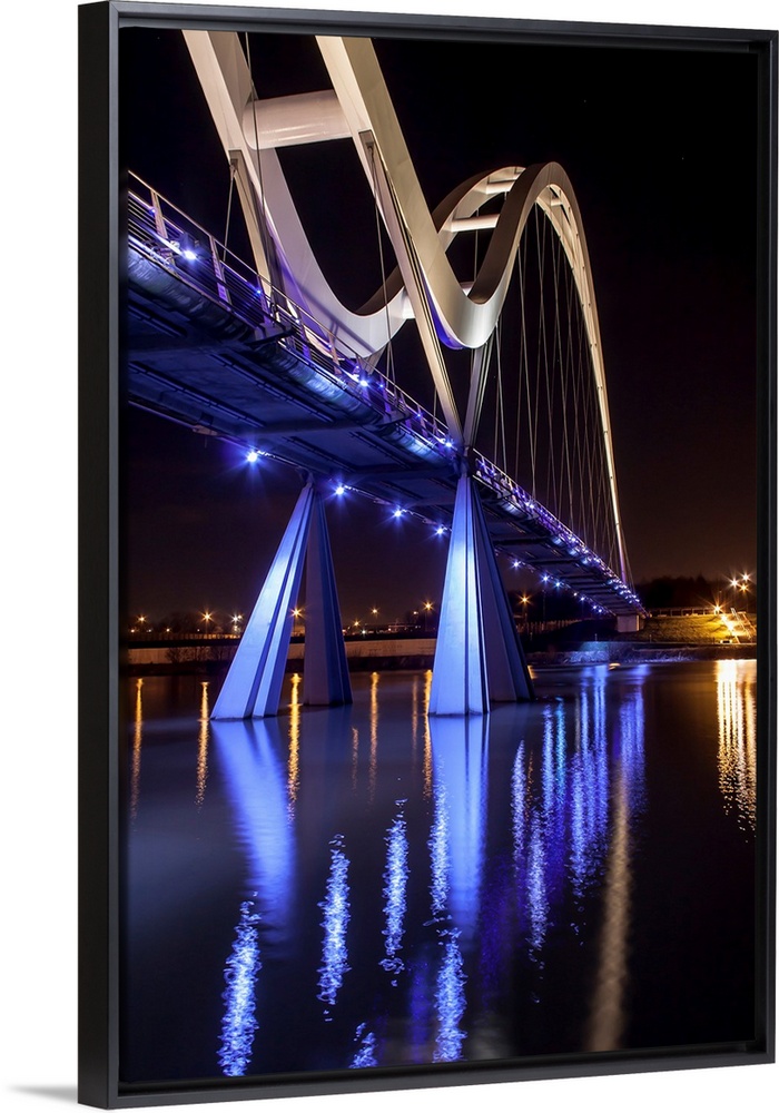 <p>Infinity Bridge with bright blue lights reflected in the water, Stockton on Tees, England.</p>