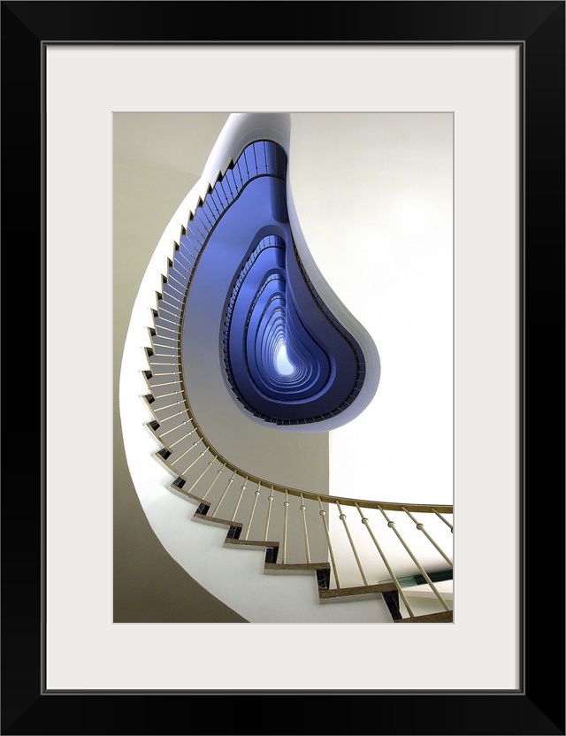 <p>View from the ground of an oddly-shaped spiral staircase, with a blue glow.</p>