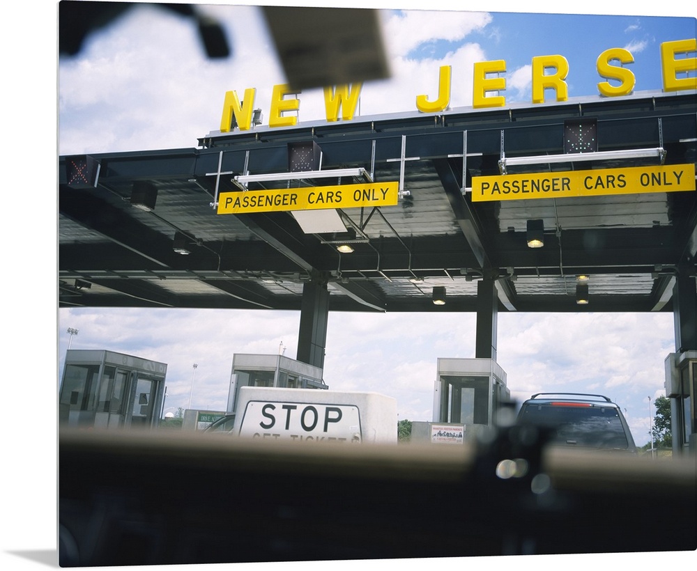 <p>Horizontal, large photograph taken through a car windshield of an information board at a New Jersey toll station.</p>