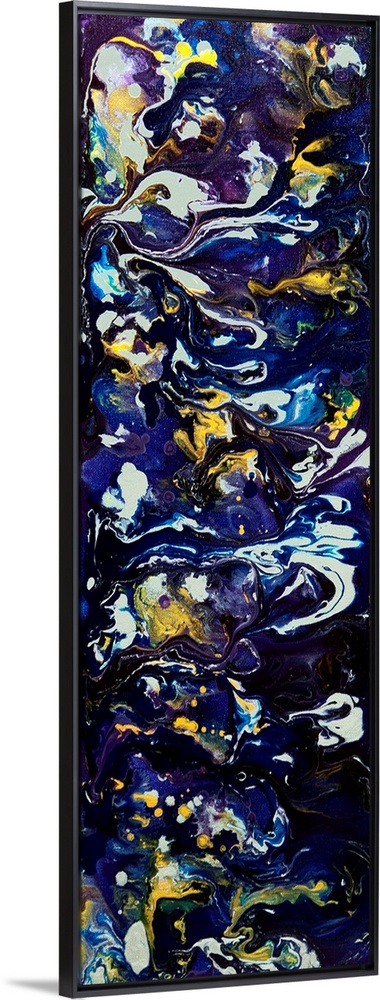 <p>A contemporary abstract painting using deep dark purples and blue tones with hints of yellow.</p>