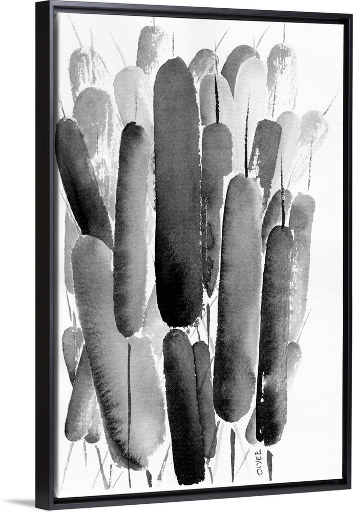 <p>Contemporary ink painting of cattails in black and white.</p>