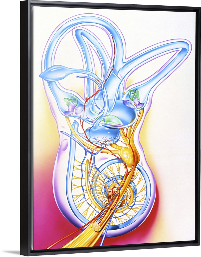 <p>Inner ear. Artwork of a healthy human inner ear, the fluid-filled passages of the membranous labyr- inth associated with hearing and balance. The snail shell-like cochlea (centre right) converts sound vibrations into nerve impulses. The organ of balance comprises three semicircular canals (blue loops, centre left), and the saccule and utricle (blue ovals, centre). Each canal detects movement in a different direction due to the pressure chan- ges caused by the motion of their fluid. The utri- cle (larger) and saccule respond to gravity, giv- ing the position of the head. Nerve impulses from the inner ear pass to the brain along the auditory (vestibulocochlear) nerve (yellow, centre right).</p>