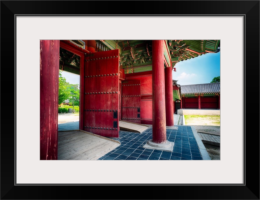 <p>Red columns and large doors in the Eastern Palace in Seoul, South Korea.</p>