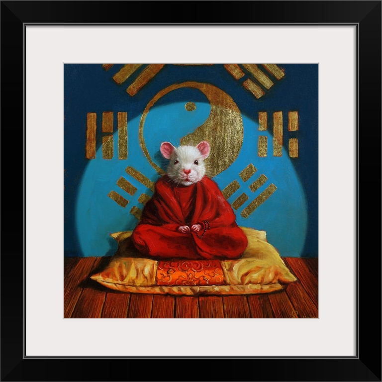 <p>A contemporary painting of a mouse meditating on a cushion.</p>