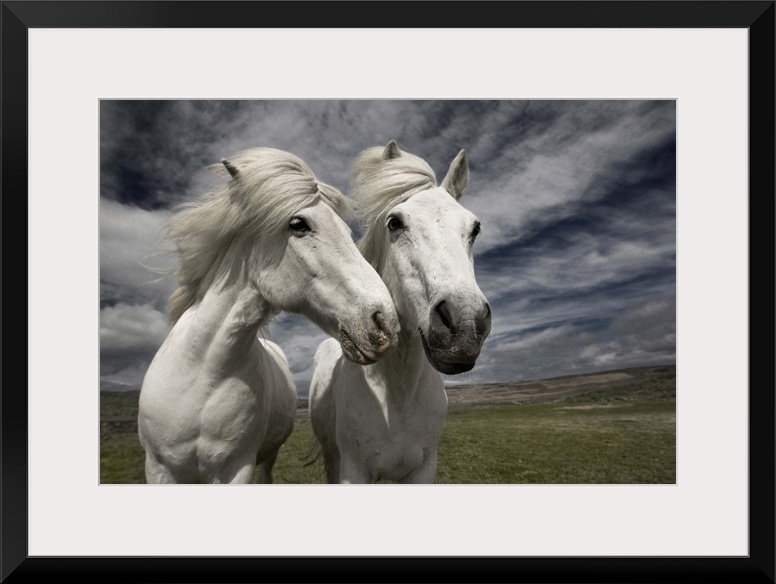 <p>Two white horses standing together in the Icelandic landscape.</p>