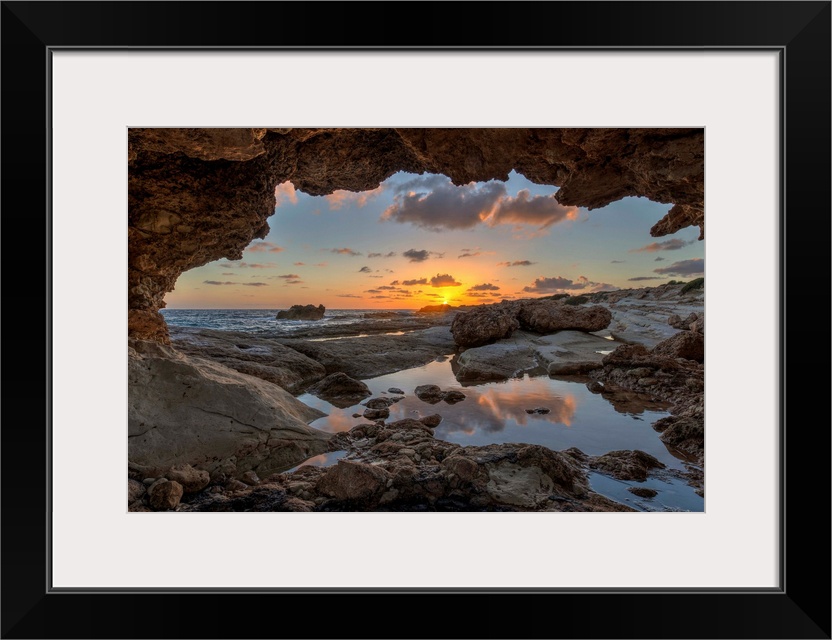 <p>Sunset at the beach from inside a coastal cave in Paphos, Cyprus.</p>