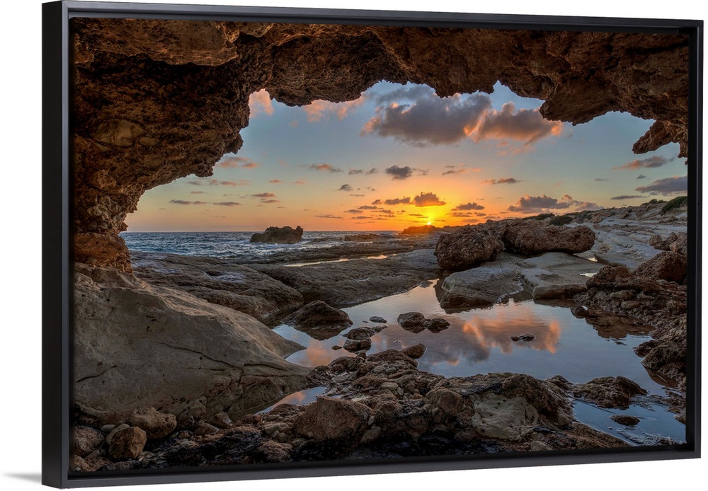 <p>Sunset at the beach from inside a coastal cave in Paphos, Cyprus.</p>