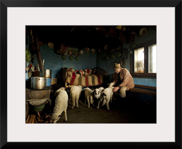 <p>A man sits with a flock of lambs in his small house.</p>