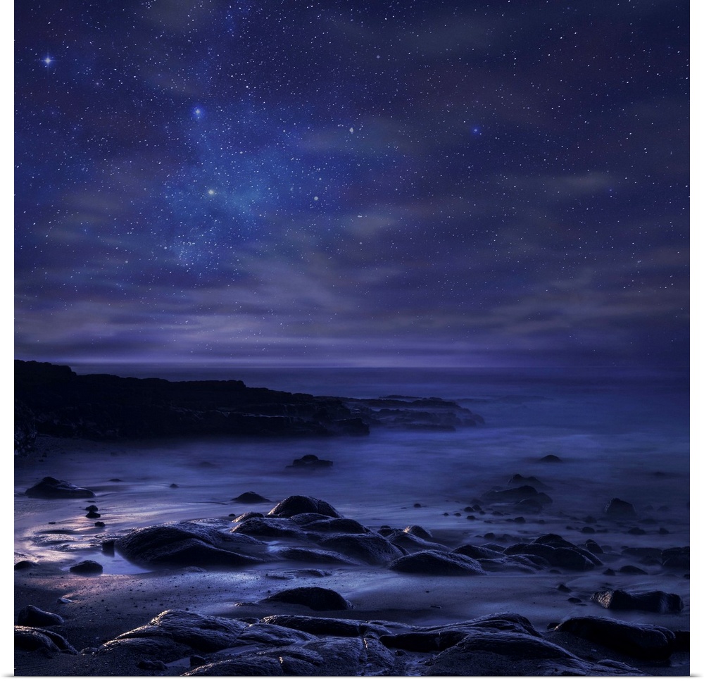 <p>Rocky shoreline under a beautiful starry sky.</p>