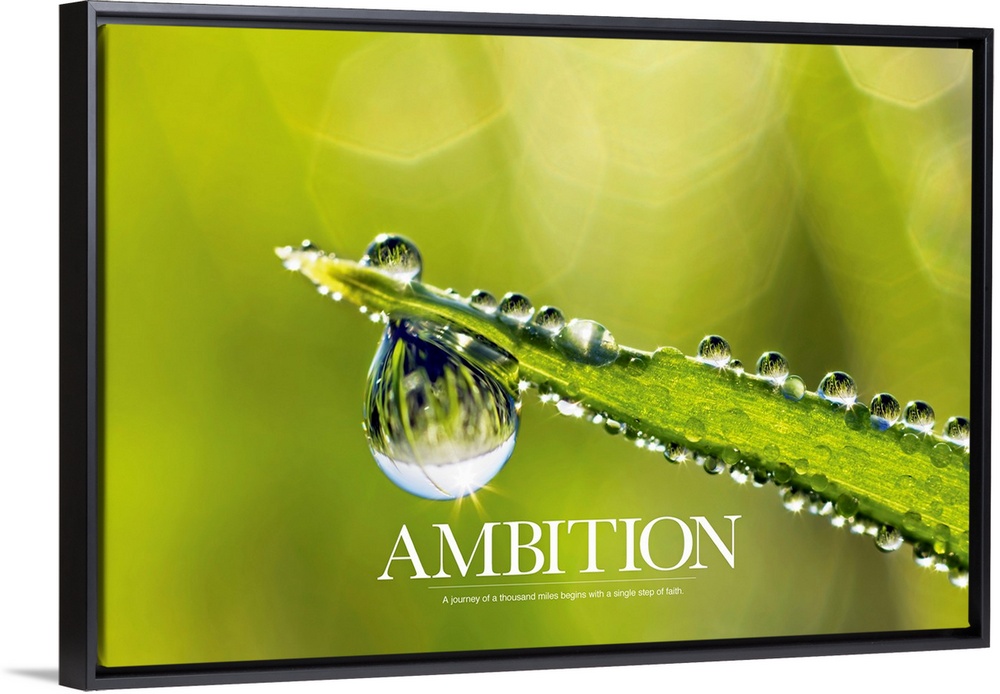<p>Big, landscape, inspirational artwork of a single, pointy leaf covered in dew drops, one large drop about to fall from the end. Under the leaf reads "Ambition: A journey of a thousand miles begins with a single step of faith".</p>