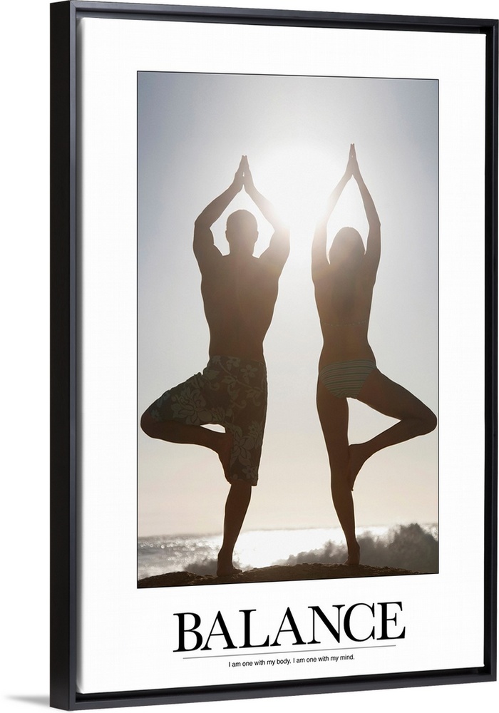 <p>Poster showing a man and a woman balancing in a yoga pose on the beach with the ocean in the background and the sun shining.</p>