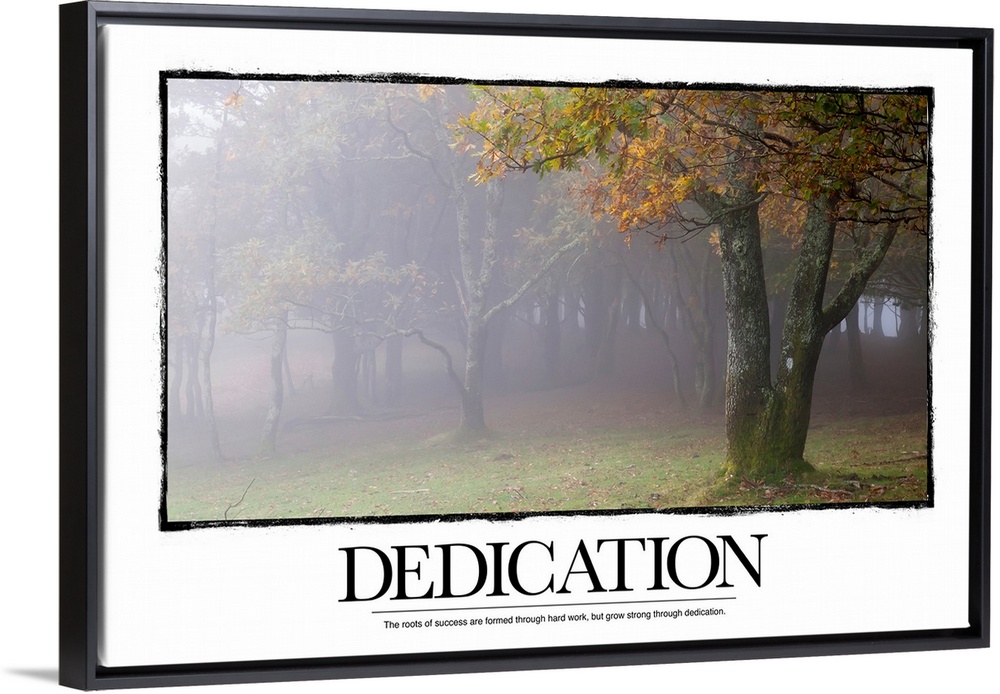 <p>The roots of success are formed through hard work, but grow strong through dedication. This inspirational poster shows several strong trees in a forest full of fog in the fall.</p>