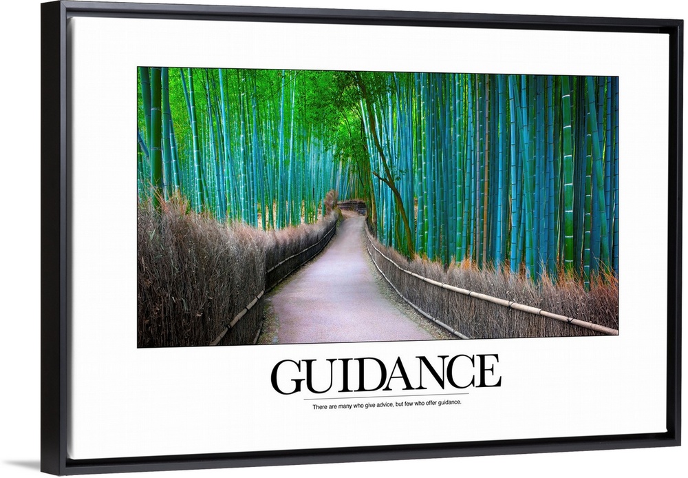 <p>Big inspirational canvas of a bamboo forest with a pathway going through it and a saying about guidance beneath it.</p>