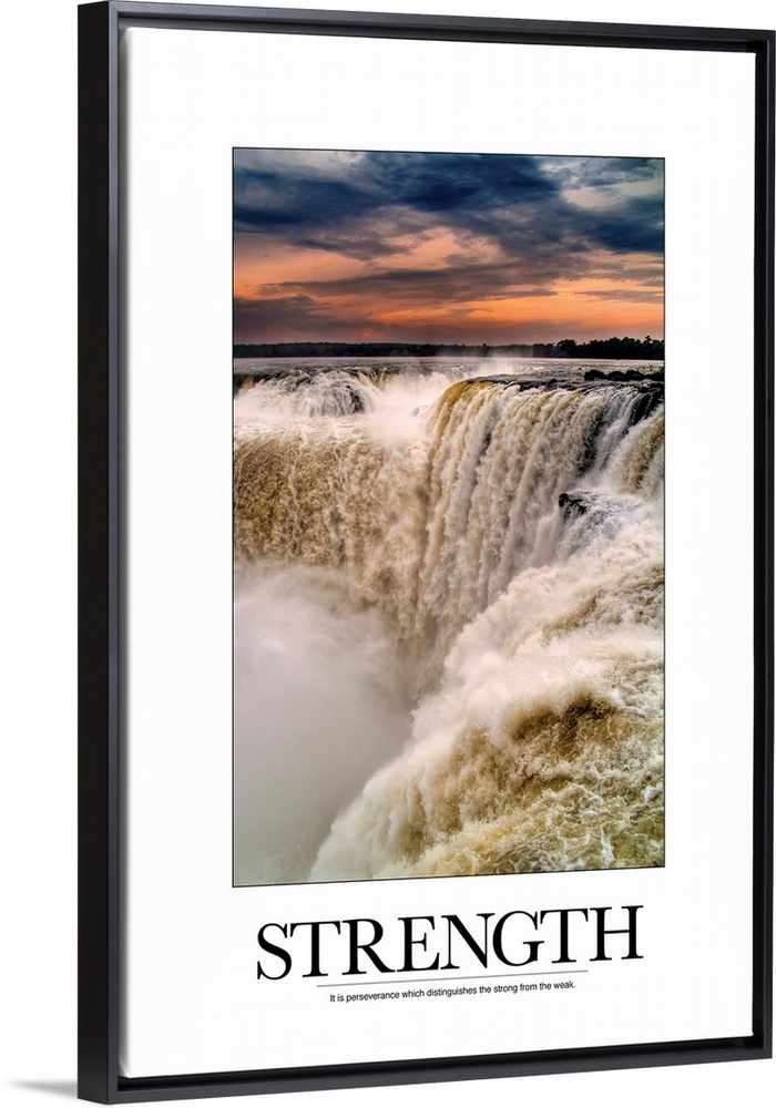<p>Big, vertical motivational wall hanging of large waterfalls beneath a vibrant sunset. The image is surrounded by a white border, at the bottom, text reads "Strength: It is perseverance which distinguishes the strong from the weak".</p>