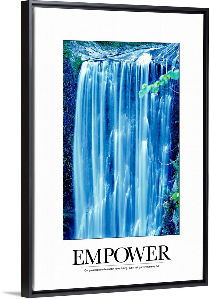 <p>A large waterfall is photographed and surrounded by a white border. The word Empower is placed on the piece just below the picture along with an inspirational quote.</p>