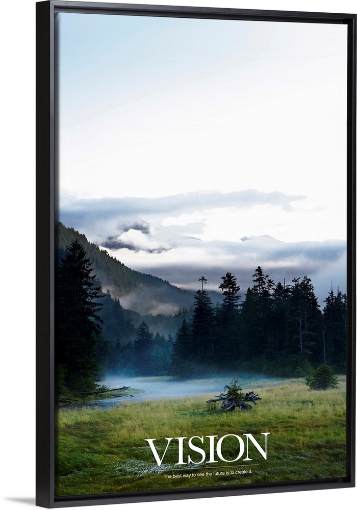 <p>Big, vertical inspirational wall hanging of an open sky above a misty mountain scene, text at the bottom reads "Vision: The best way to see the future is to create it".</p>