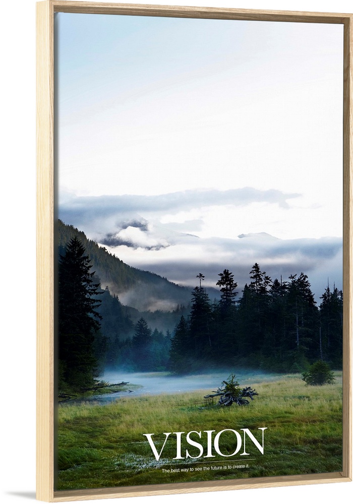 <p>Big, vertical inspirational wall hanging of an open sky above a misty mountain scene, text at the bottom reads "Vision: The best way to see the future is to create it".</p>