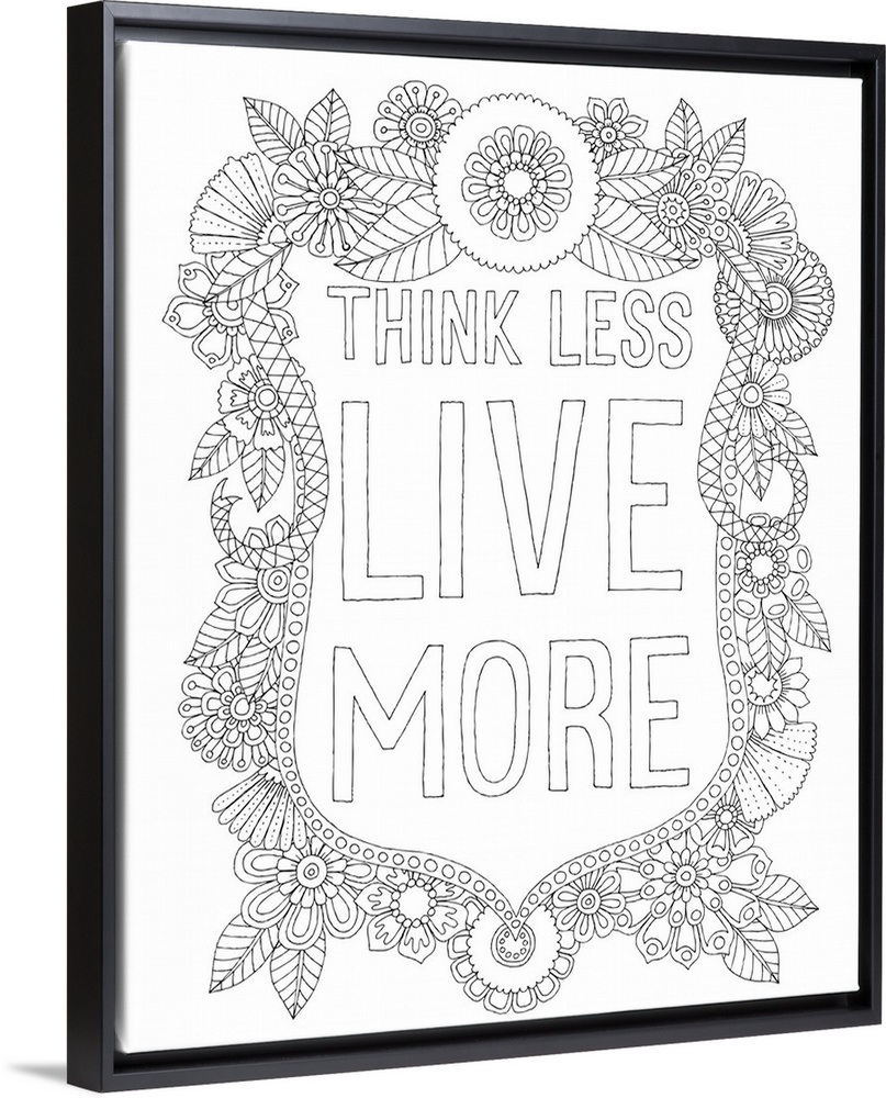 <p>Black and white line art of a floral design with the phrase "Think Less Live More" written in the middle.</p>