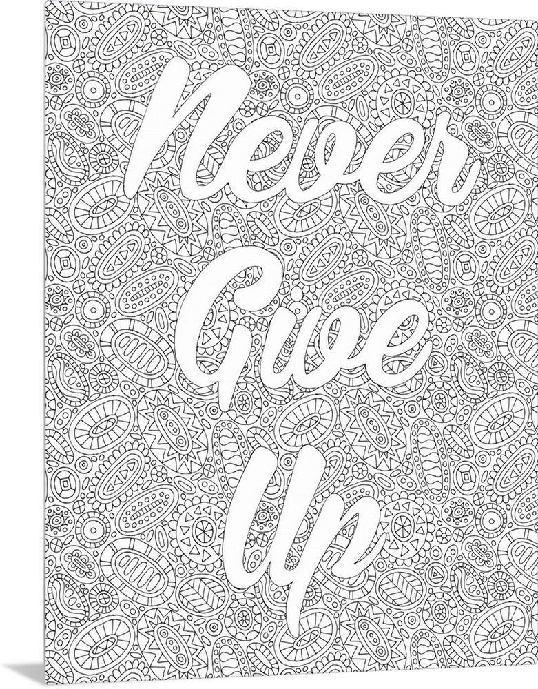 <p>Inspirational black and white line art with the phrase "Never Give Up" written on top of an intricately deigned background.</p>