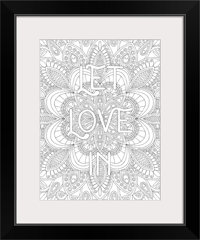 <p>Inspirational black and white line art with the phrase "Let Love In" written on top of an intricate flower design.</p>