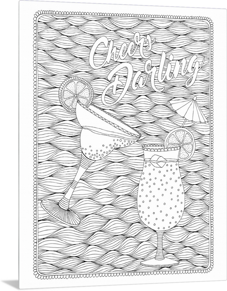 <p>Black and white line art with the phrase "Cheers Darling" written on top of a wavy design with two cocktail glasses</p>