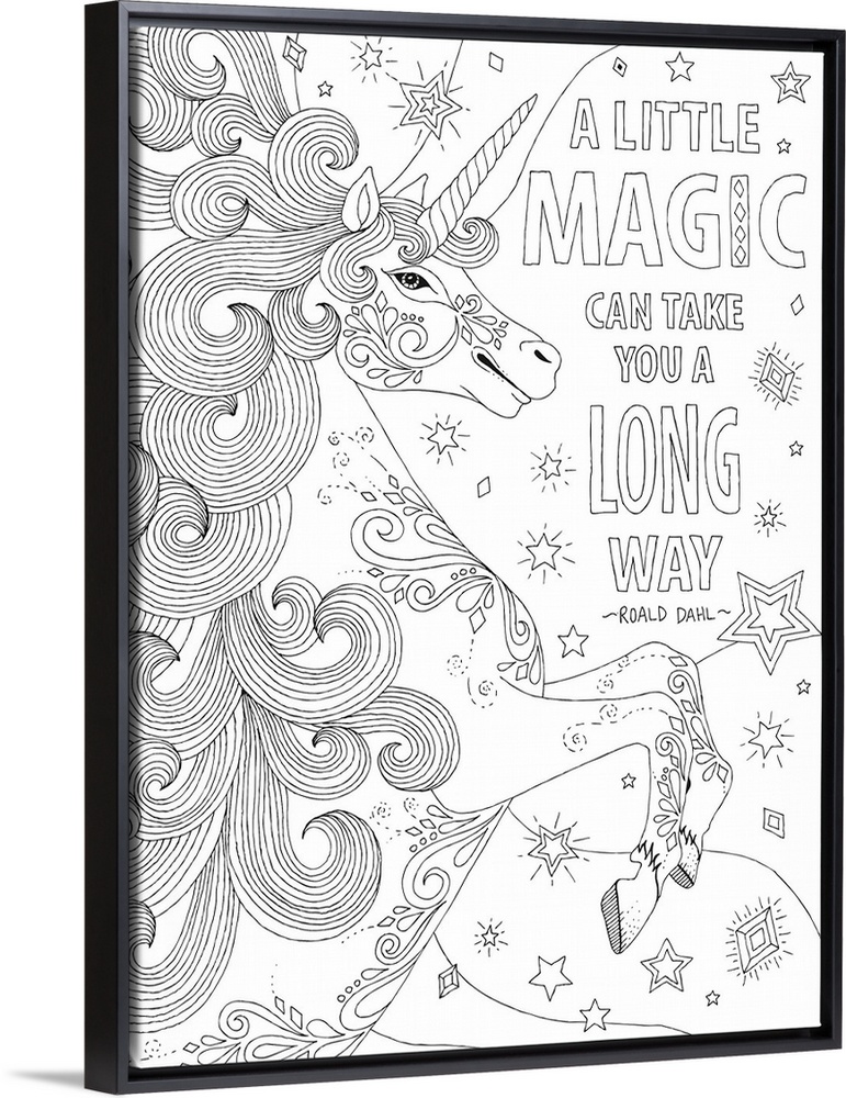 <p>Black and white line art with a uniquely designed unicorn surrounded by stars and jewels and the quote "A Little Magic Can Take You a Long Way" - Roald Dahl</p>