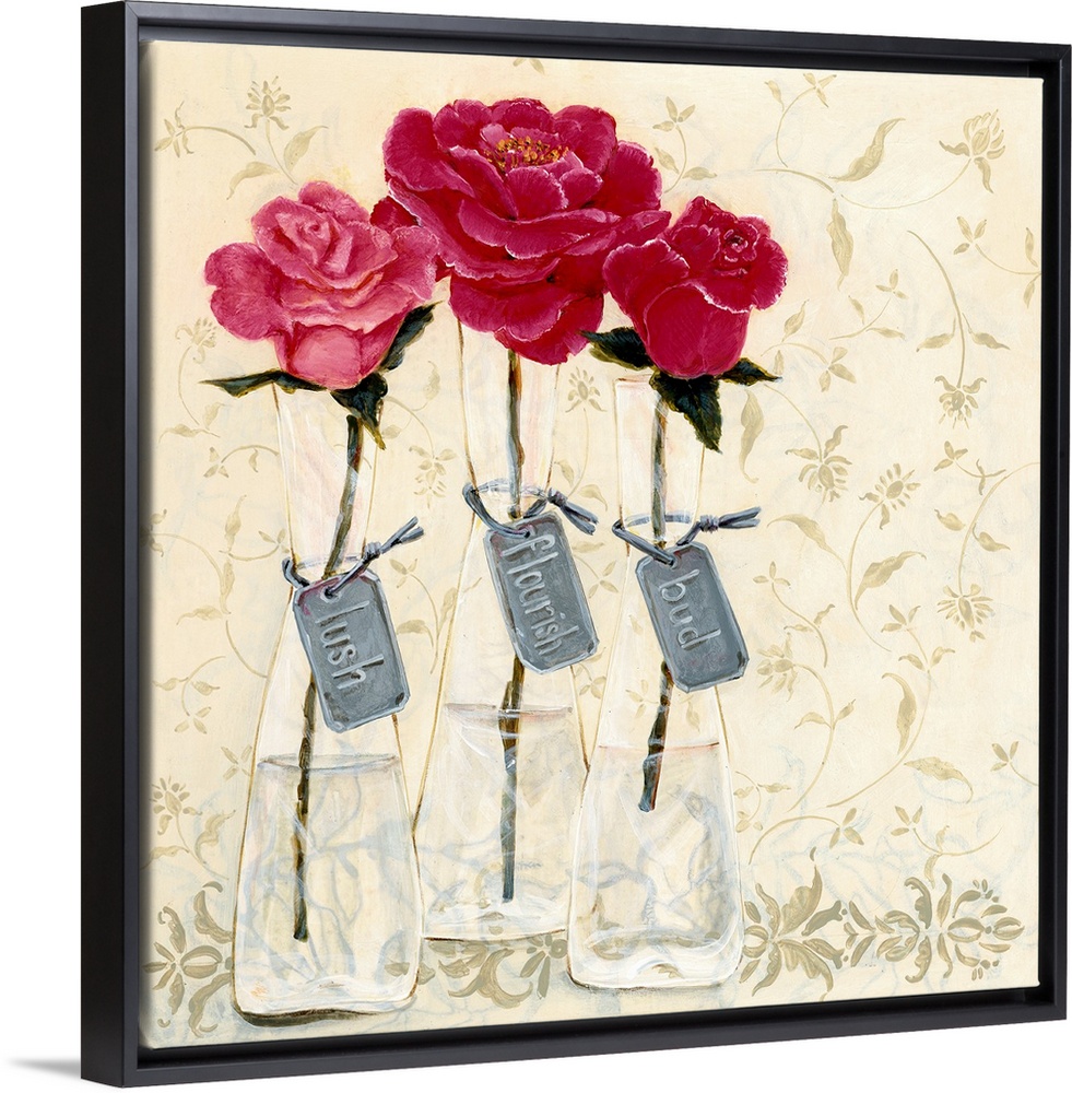 <p>Contemporary painting of three flowers in shades of pink with tags attached to the vases that read left to right, "Lush, Florish, Bud" over a light patterned background.</p>