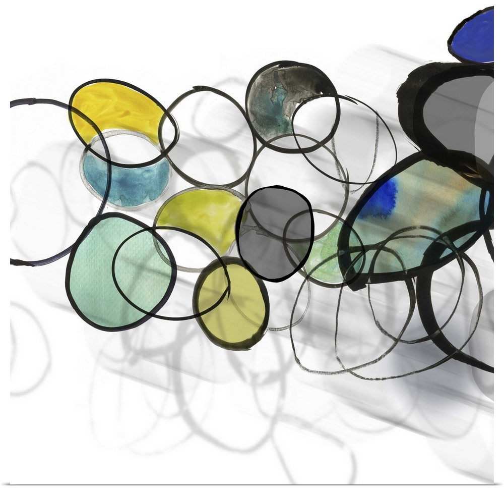 <p>Square painting of circles and rings in multiple colors with a shadow effect beneath.</p>