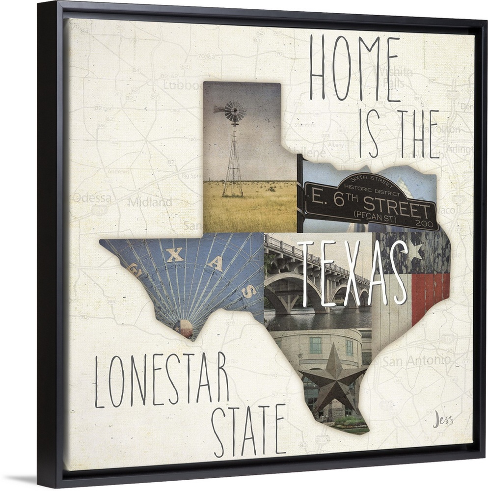 <p>Several scenes in Texas in the outline of the state with "Home is the Lonestar State."</p>