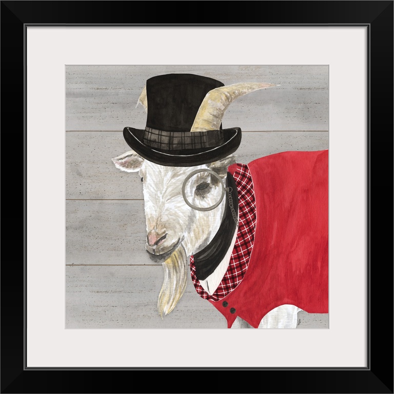<p>A white goat wearing a red vest, top hat and monacle against of grey wood background.</p>