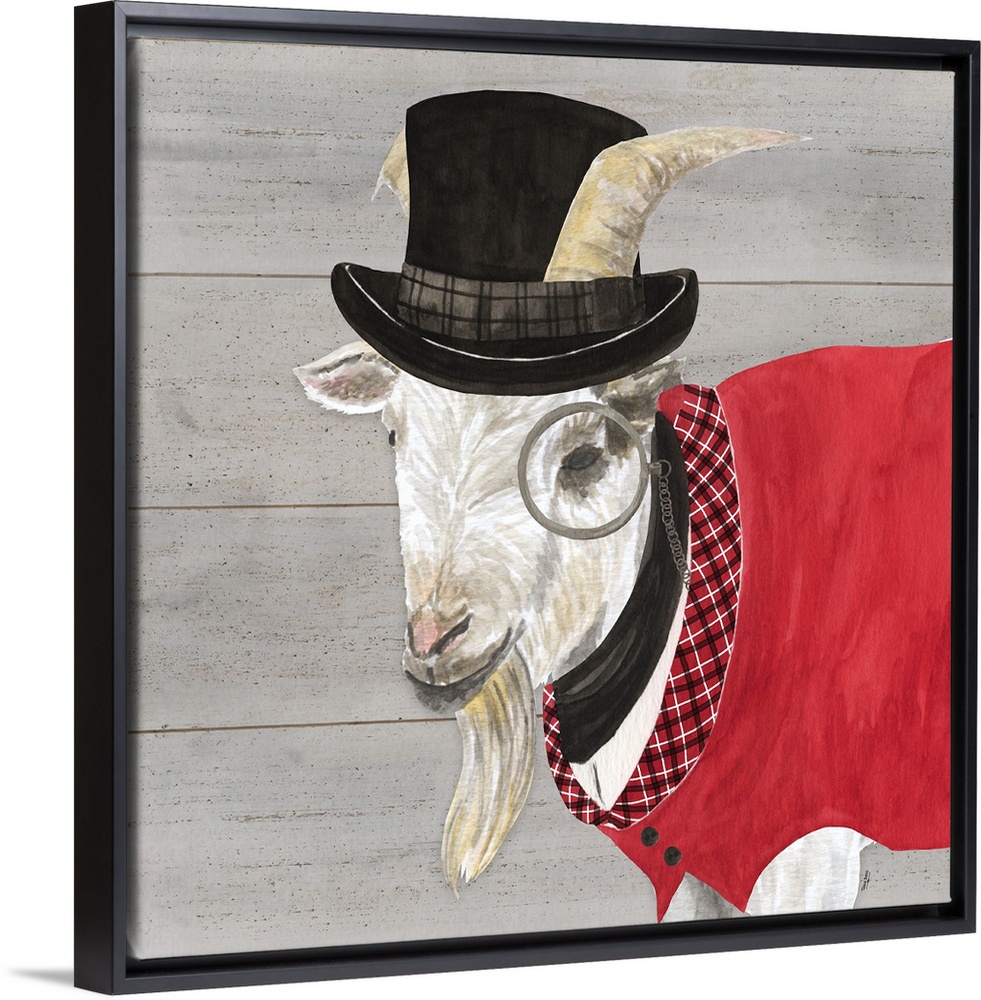 <p>A white goat wearing a red vest, top hat and monacle against of grey wood background.</p>